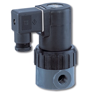 The GEMÜ 102 directly controlled 2/2-way solenoid valve has a completely plastic encapsulated coil. The armature is sealed by a bellows made of PTFE backed by an additional safety diaphragm. The valve body is available in various materials and with a straight through or angle valve body design.