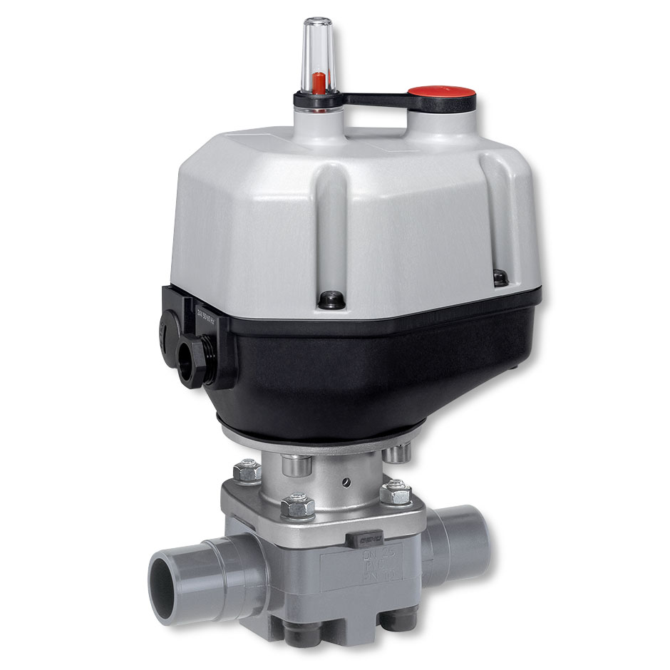 Valvola a membrana, attuatore elettrico, distanziatore in acciaio inox, azionamento di emergenza manuale, indicatore di posizione