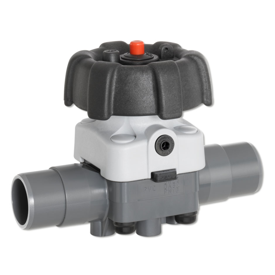 Valvola a membrana, attuatore in plastica, indicatore ottico di posizione, azionamento manuale